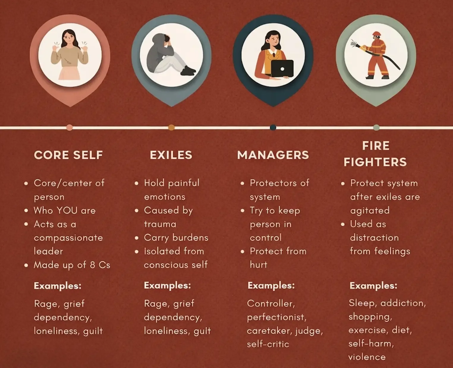 To understand how IFS therapy works, it helps to get familiar with the different “characters” in your inner world. These parts ted to fall into a few key roles.